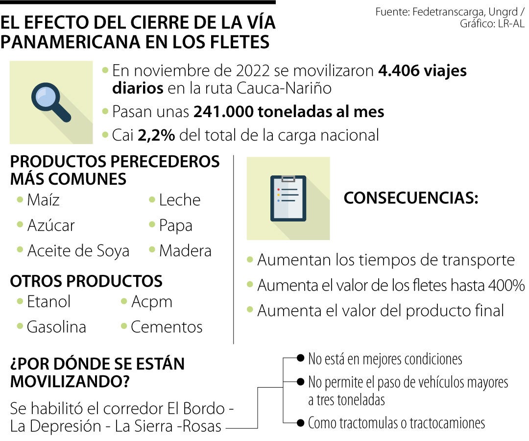 "Un carro de Ipiales a Cali, digamos con papa, podía cobrar $1,2 millones antes del derrumbe, hoy ese mismo camión está cobrando $5 millones. Hay rutas en que el tema se ha disparado completamente por la dificultad para moverse. Y se ve entonces que si en Cali una libra de papa estaba en $700 ya esté en $1.700", precisa.