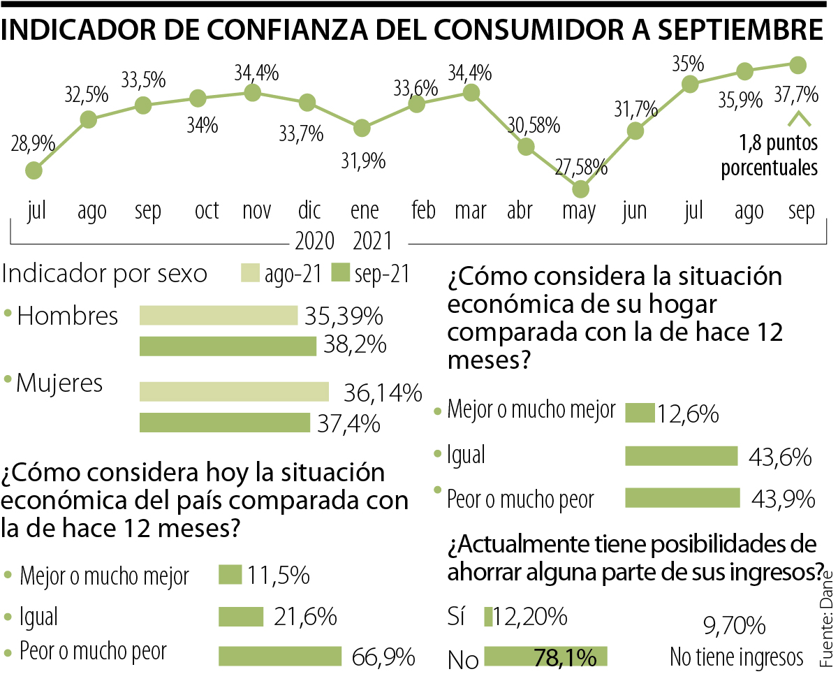 El Departamento Administrativo Nacional de Estadística (Dane) reveló que el Indicador de Confianza del Consumidor subió 1,8 puntos porcentuales en septiembre frente a agosto y, a pesar de que aún sigue por debajo de la barrera de los 50 puntos, lo cual se traduce en pesimismo, el indicador llegó a su nivel más alto desde que iniciaron las mediciones.