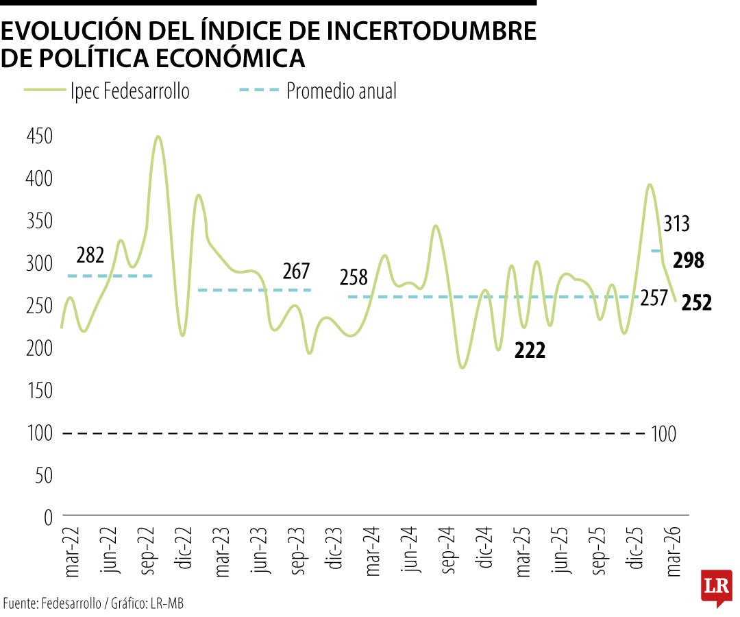 En marzo, el Índice de Incertidumbre de Política Económica, Ipec, que publica Fedesarrollo se ubicó en 252 puntos. Esto equivale a una reducción de 46 puntos frente a febrero y a un aumento de 30 puntos frente al registro de marzo del año pasado. Con este resultado, el índice completa 90 meses por encima del promedio histórico observado entre 2000 y 2019.
