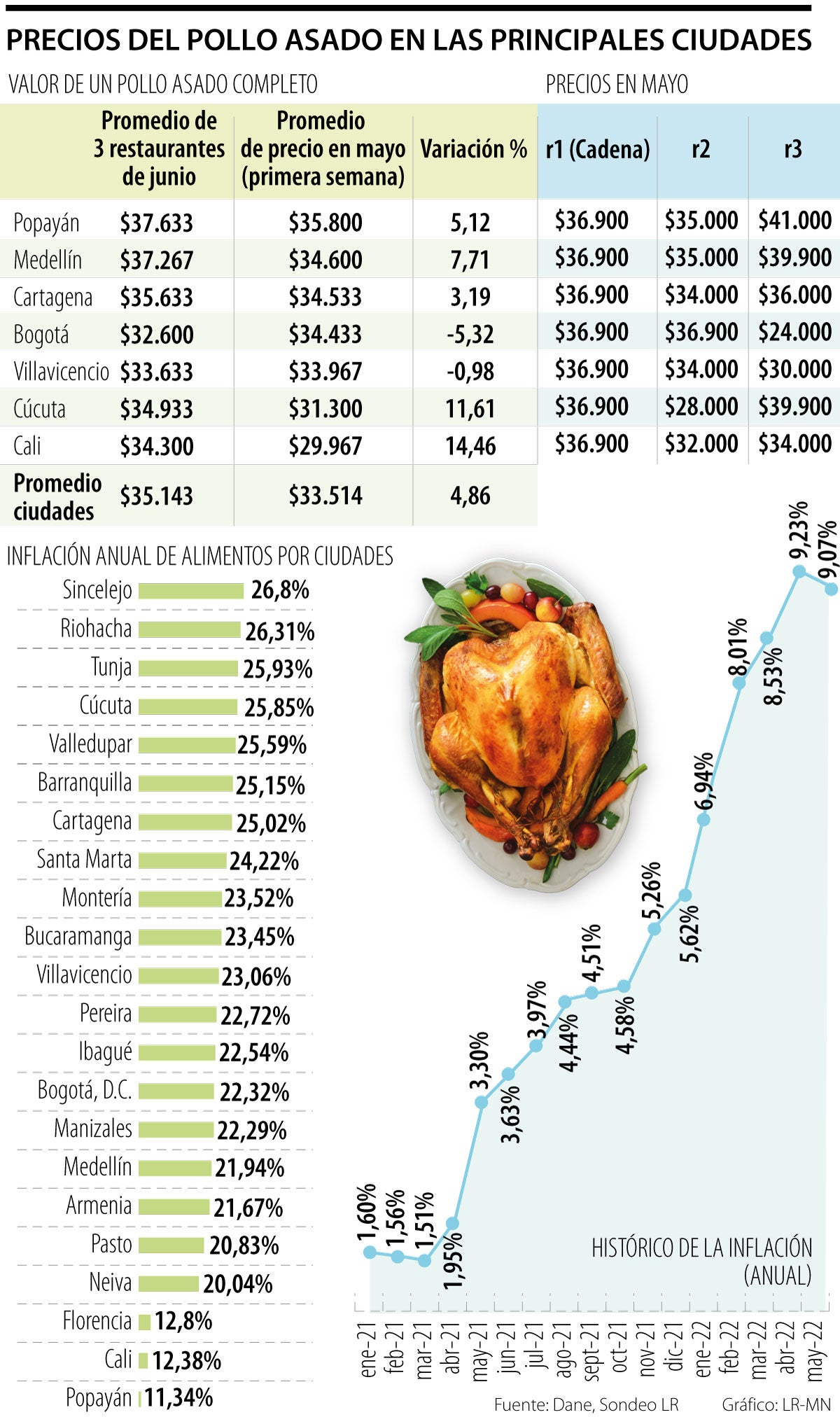 El pasado 5 de mayo, La República presentó por primera vez el Índice del Pollo Asado, para comparar los precios de un producto consumido por todas las clases sociales y que refleja el impacto de la inflación en los consumidores. En esta segunda edición, se encontró que ha habido un incremento de 4,86% en los precios de este alimento en siete ciudades.
