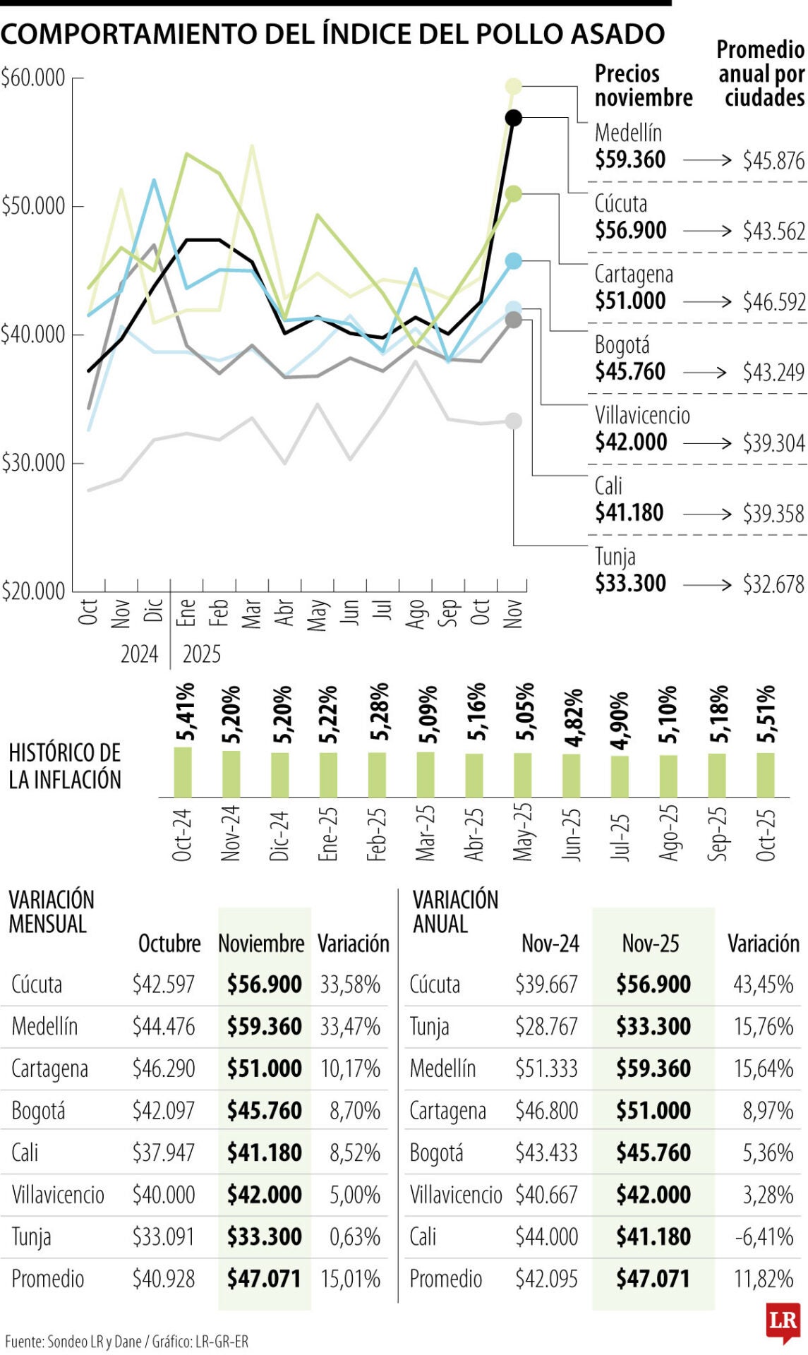 El valor promedio de un pollo asado en noviembre fue de $47.100. En cuanto a las ciudades con los precios más altos, y a diferencia de octubre, Medellín registró el pollo asado más caro, con $59.360, seguida de Cúcuta, con $56.900. El top cinco lo completaron Cartagena, con $51.000; Bogotá, con $45.760; y Villavicencio, con $42.000, Tunja continúa siendo la capital con el pollo asado más barato entre las consultadas, con $33.300.