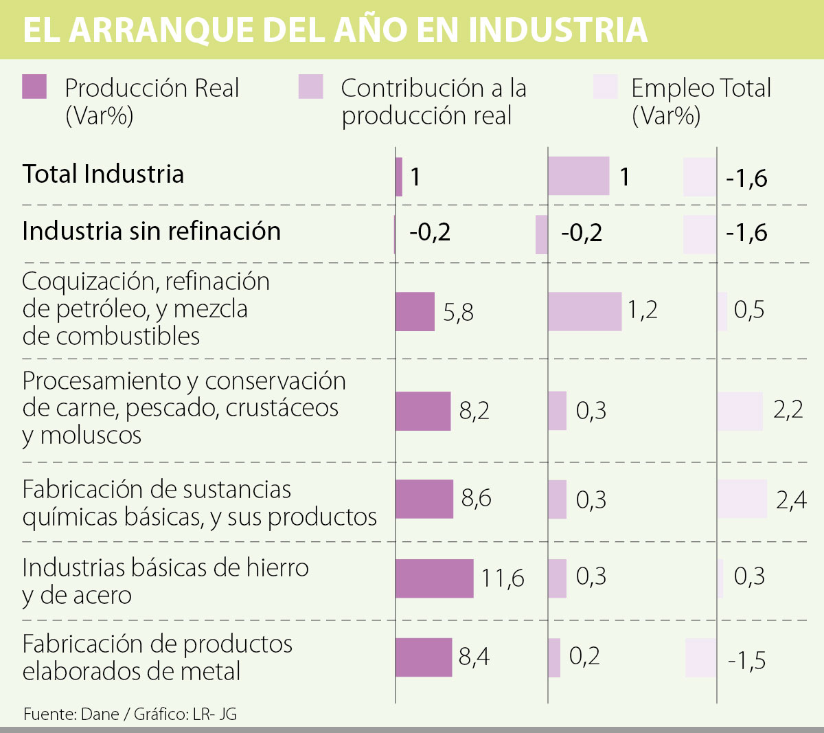 Aunque la producción real de todo el sector presentó números positivos, fue jalonada por las actividades petroleras, ya que si no se tiene en cuenta la refinación, hubo una caída de 0,2% en la producción.