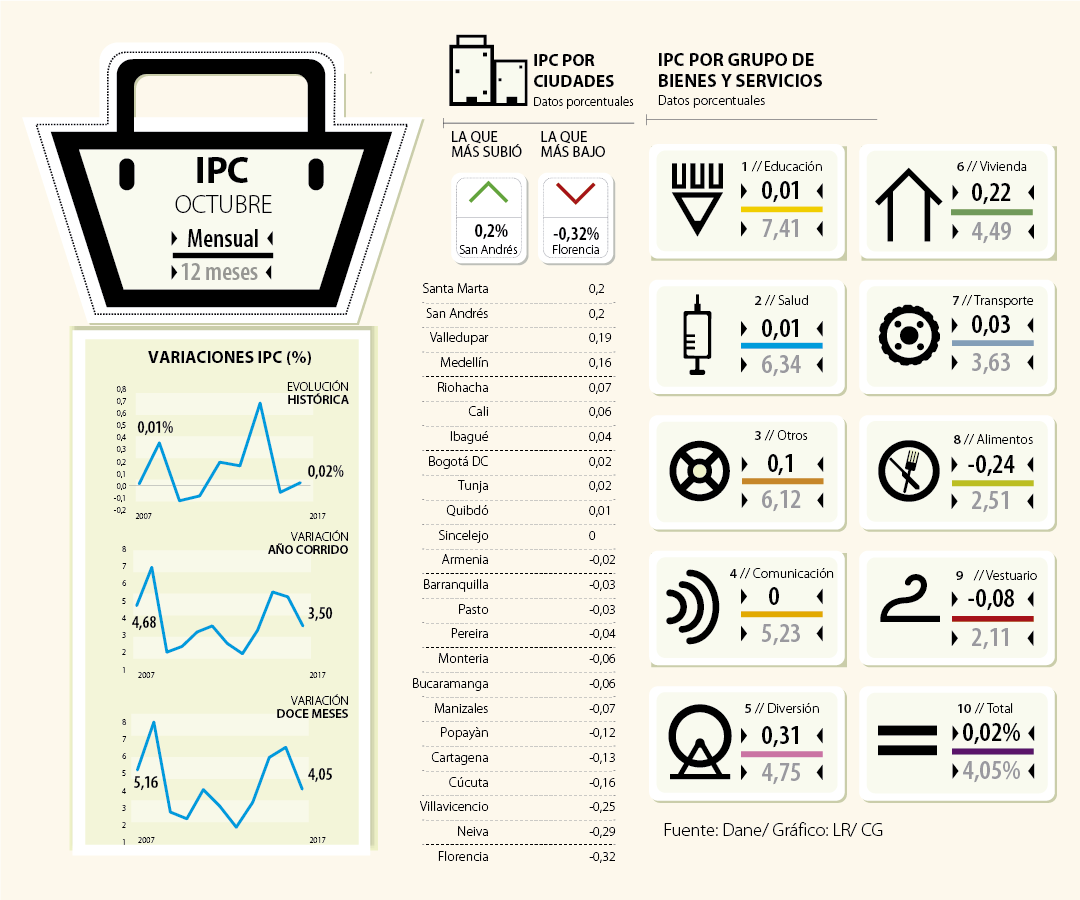 Según el Dane, en octubre de 2017 cuatro de los nueve grupos reportados en el IPC presentaron variaciones mensuales inferiores a las registradas en el mismo mes del año anterior: Vestuario, Salud, Transporte y Otros gastos.