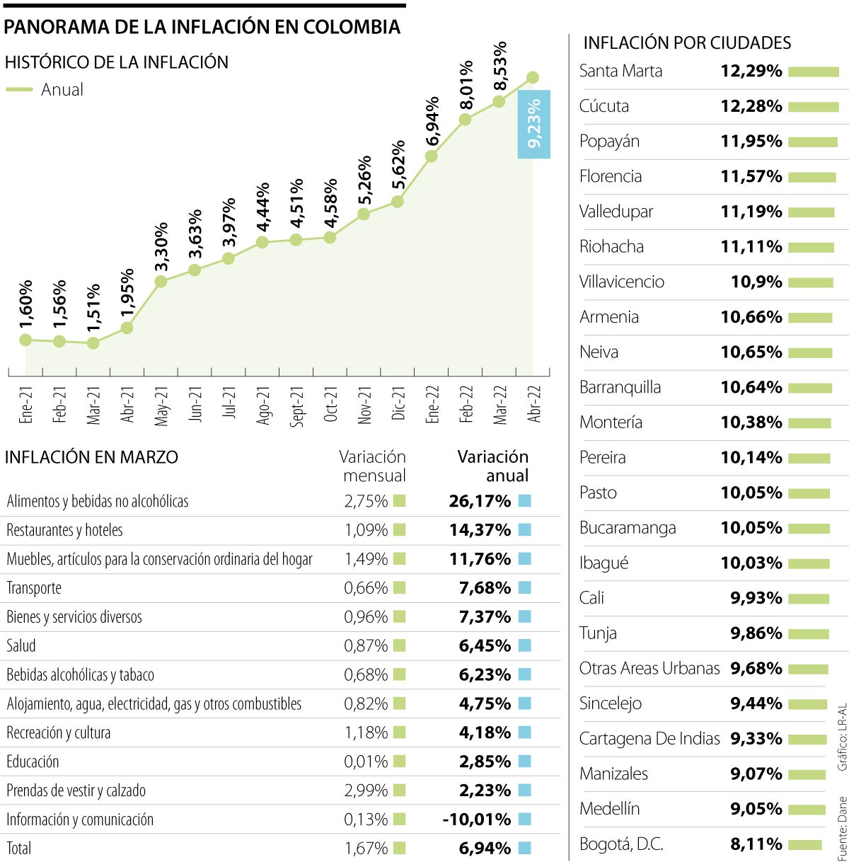 El Departamento Administrativo Nacional de Estadística (Dane) reveló este jueves el dato de inflación. Como habían previsto analistas y el mismo Banco de la República, el dato siguió con su rumbo alcista y alcanzó 9,23% en su dato anual, convirtiéndose en el registro más alto en 21 años.