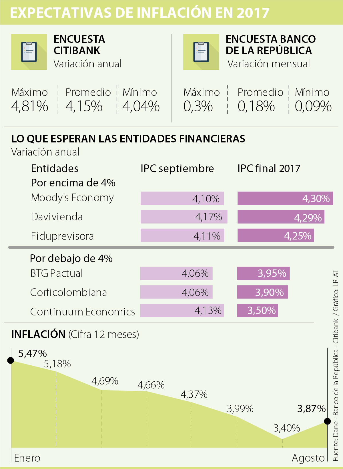 Hasta el momento, las proyecciones de los analistas indican que el Índice de Precios al Consumidor (IPC) para septiembre tendría una variación promedio de 4,15%, de acuerdo con la encuesta del Citibank.