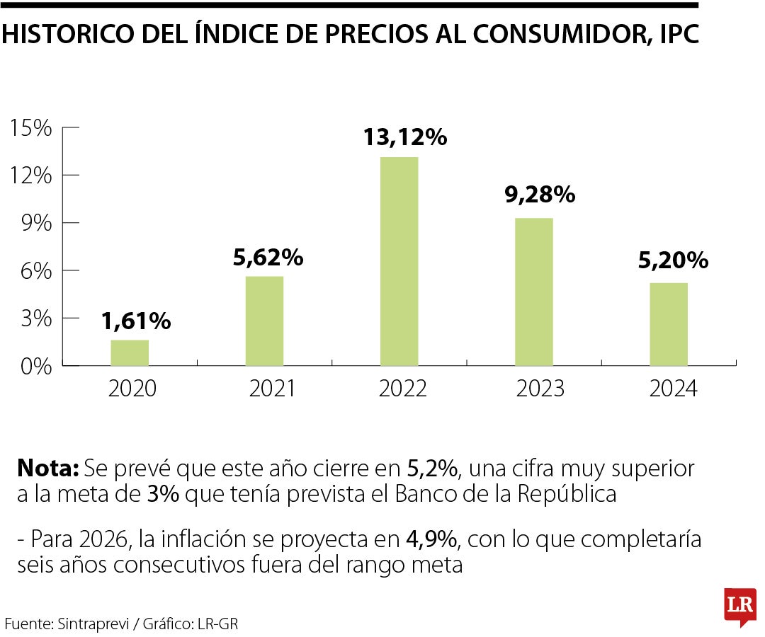 Según un informe de investigaciones económicas de la Corficolombiana, la inflación en 2025 cerraría el año en 5,2%, una cifra muy similar a la de hace un año, lo cual indicaría una pausa en la desinflación, más no una caída.