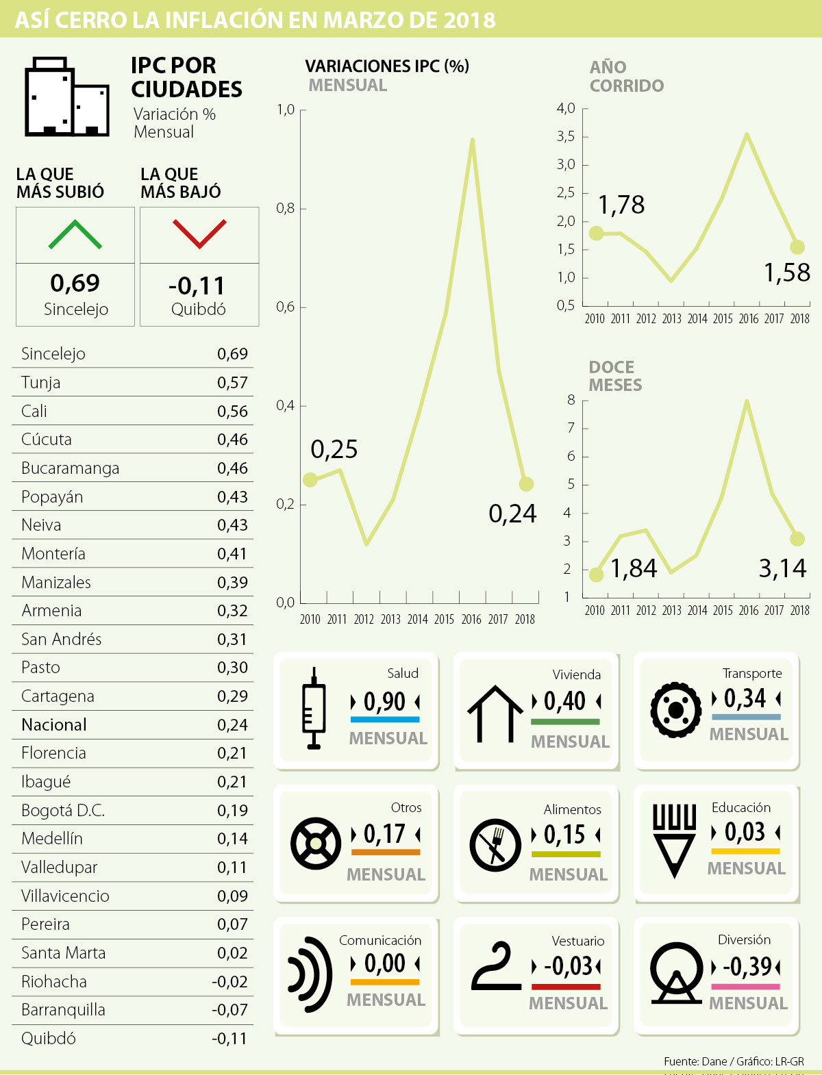 El dato de inflación ayer volvió a sorprender, y por partida doble, cuando el Dane (Departamento Administrativo Nacional de Estadística) informó que la variación del Índice de Precios al Consumidor (IPC) en marzo fue 0,24%, un dato que no solo fue mucho menor a lo esperado por los analistas de Citibank y lo proyectado por la encuesta del Emisor (0,36% y 0,38%), sino que además fue 0,23 puntos porcentuales inferior a marzo del año pasado cuando la cifra fue de 0,47%.