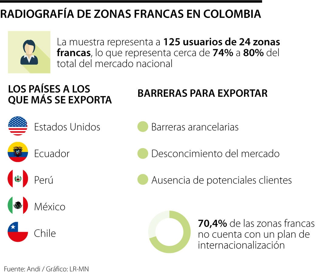 Del total, 70,4% de las zonas francas no cuenta con un plan de internacionalización, que es una de las condiciones para la tarifa diferencial de la zona franca. El informe también deja ver que, pese a que no cuentan con un informe de internacionalización, casi 80% de los usuarios tiene claro qué producto o servicio desea exportar. Además, 60% tiene claro a qué país puede exportar su producto potencialmente.