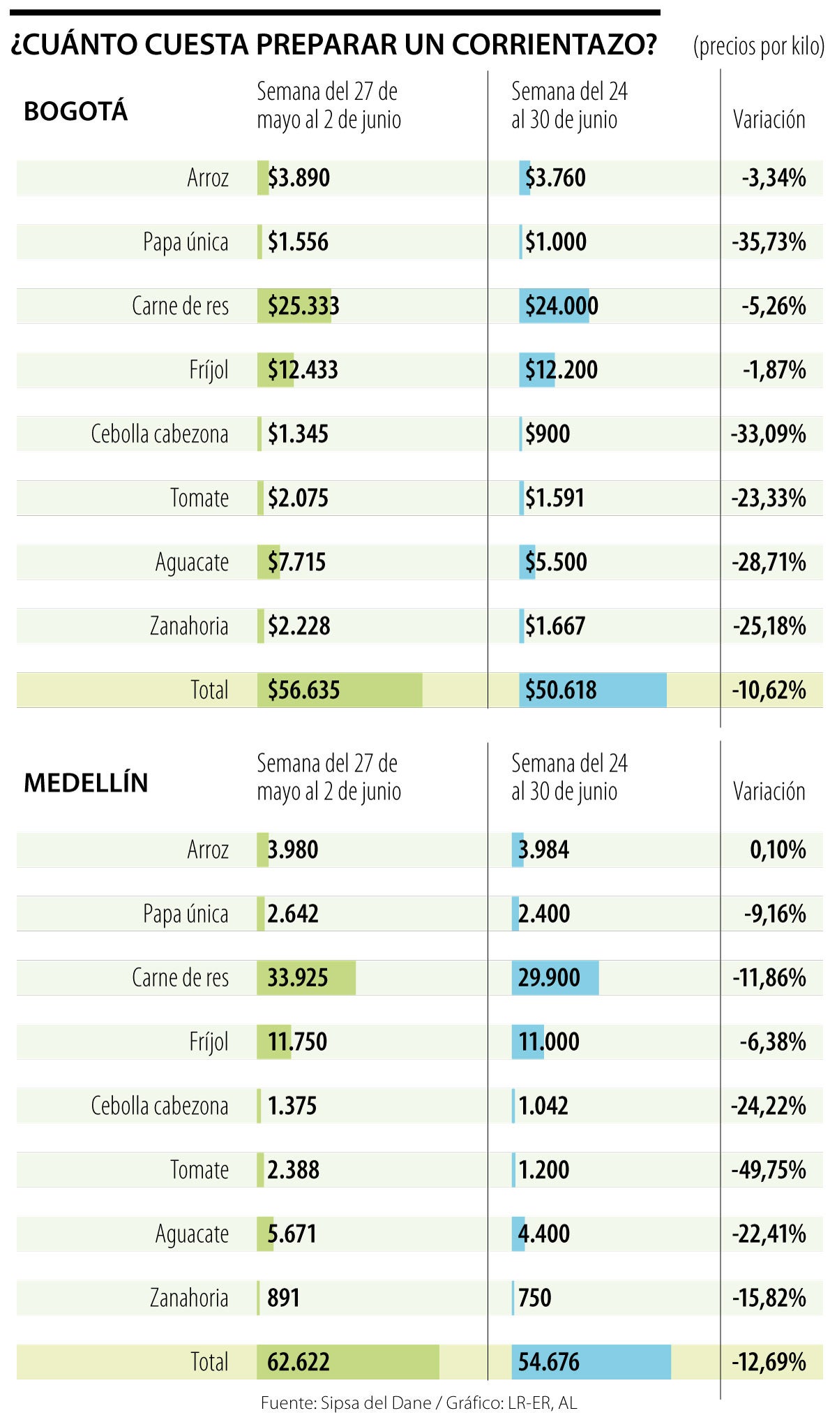 En una revisión de precios de los alimentos que compara la semana del 27 de mayo al 2 de junio contra la semana del 24 al 30 de junio, se evidenció la caída en los precios. Por ejemplo, los insumos para un almuerzo ejecutivo (corrientazo) salieron hasta 12,69% más baratos que un mes atrás.