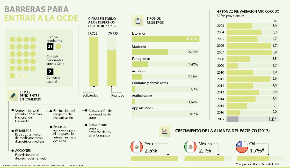 Los tres puntos que quedan pendientes, según la misiva, tienen que ver con solicitudes que ya se han hecho al interior de los comités de la Ocde. Se trata de ponerle fin al programa de chatarrización, actualizar las leyes de derechos de autor y la revisión de algunos puntos sobre la venta de medicamentos y derechos de patentes en el Plan Nacional de Desarrollo.