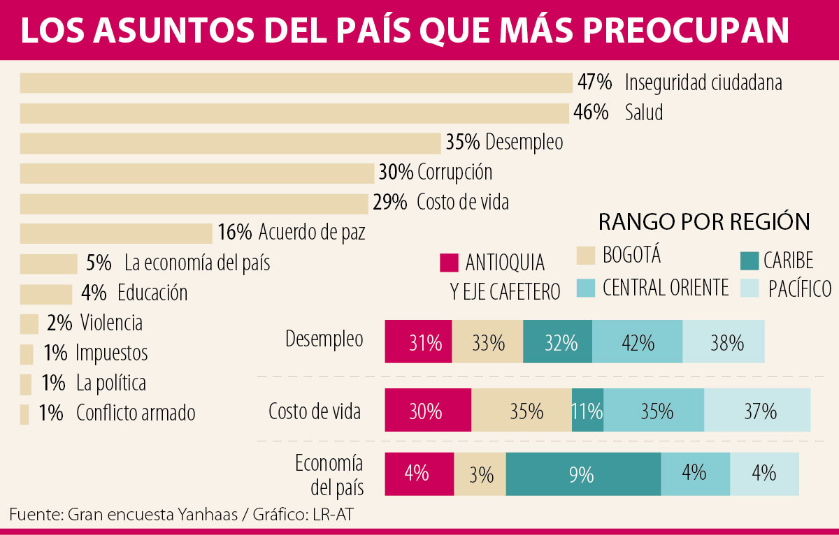 “No sorprende que esos sean los temas que más preocupan a los ciudadanos, pues se trata de temas que tocan directamente en la cotidianidad, mientras que temas como el conflicto armado o la violencia han pasado a un plano más bajo porque las noticias de secuestros y ataques guerrilleros ya no se dan, al menos no en la misma cantidad desde el acuerdo con las Farc”, dijo Germán Medina, consultor político.