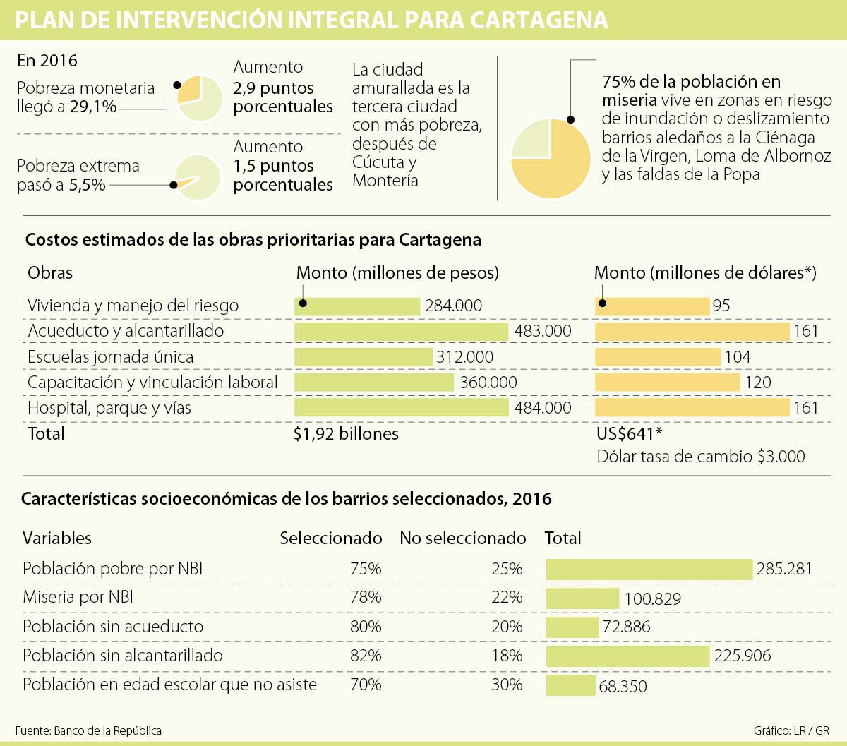 Ante este panorama, el Banco de la República presentó en el informe “Cartagena libre de pobreza extrema en el 2033”, realizado por Jhorland Ayala y Adolfo Meisel el plan de intervención integral para que la ciudad supere la pobreza extrema en el mediano plazo. Según el estudio, dicho plan tendría un costo de $1,92 billones.