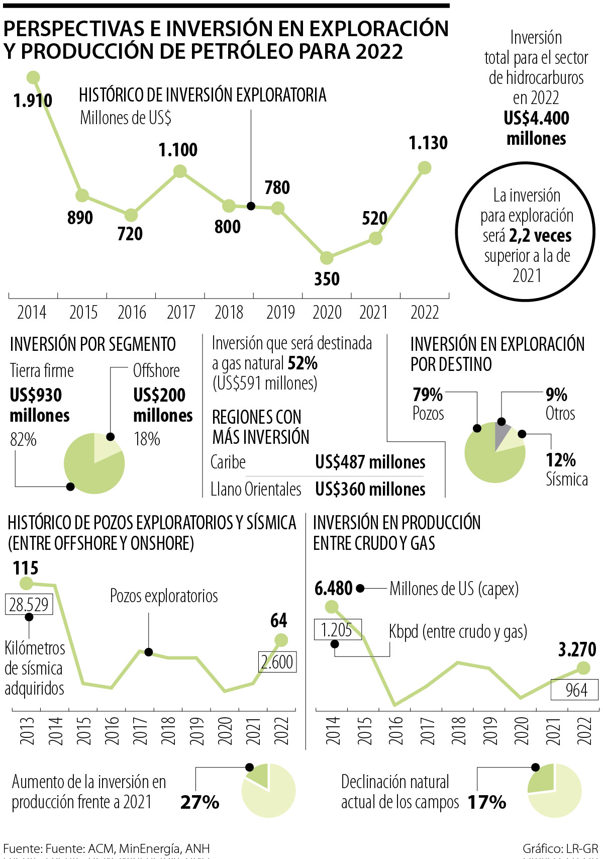La Asociación Colombiana del Petróleo y Gas (ACP) presentó el Informe de Tendencias de Inversión en Exploración y Producción (E&P), donde reveló que los recursos destinados a la exploración de hidrocarburos para 2022 serán los más altos desde 2014. La actividad exploratoria recibirá US$1.130 millones durante este año.