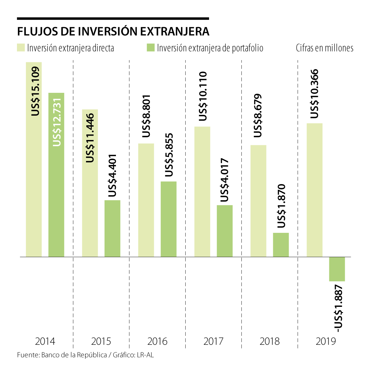 Así las cosas, se calcula que el año pasado hubo una salida de US$1.887 millones del ecosistema económico nacional, por concepto de la inversión extranjera de portafolio, la cual fue equivalente a los recursos que ingresaron por este concepto en 2018.