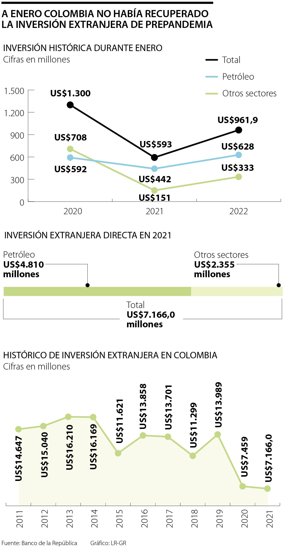 El Banco de la República reveló que durante enero, el país había recibido una inversión extranjera directa de US$961,9 millones. Es decir, 13,4% del total visto durante 2021. Como ha sido tradicional, la inversión en petróleo fue la que jalonó este resultado, al representar 65% del total recibido durante este lapso.