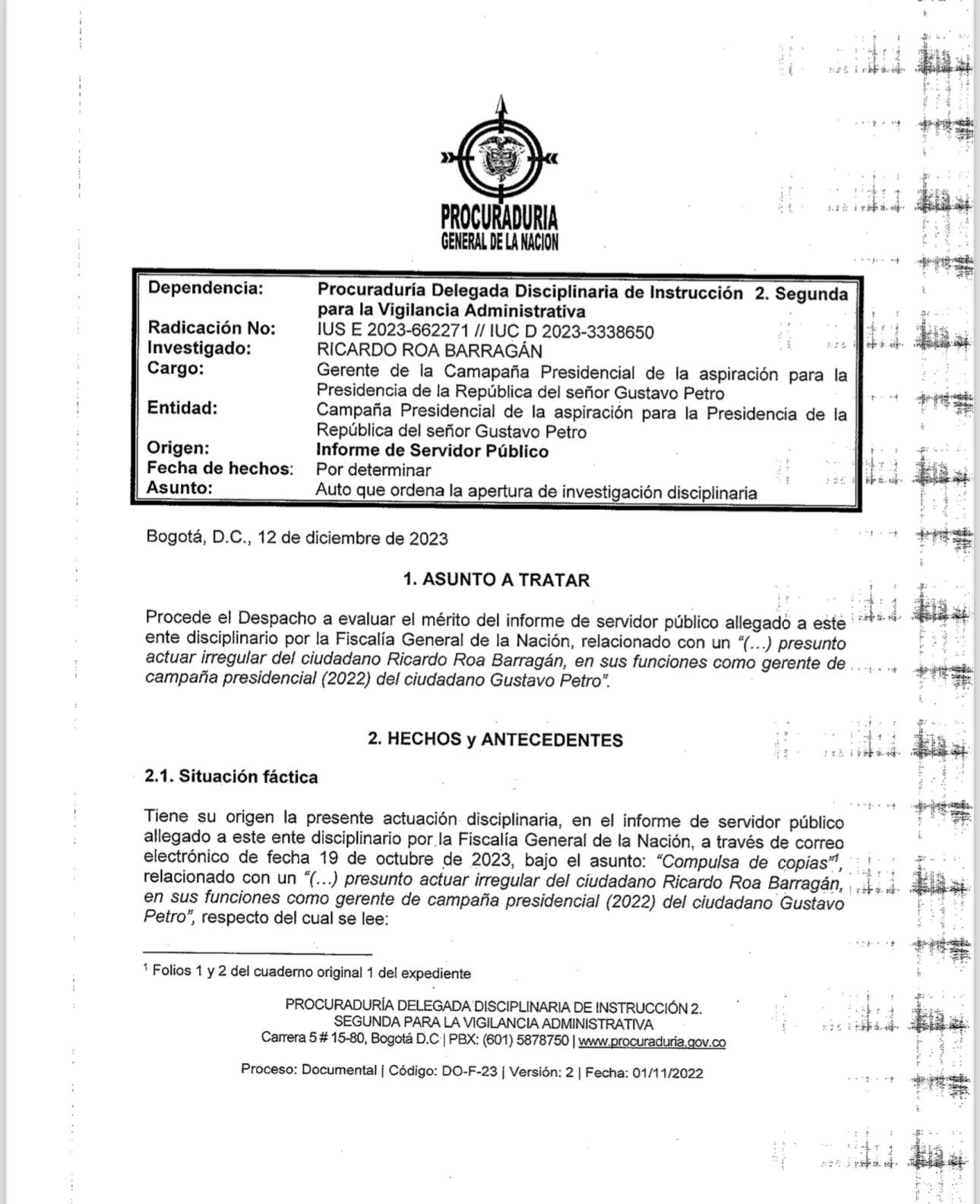 El presidente de Ecopetrol, Ricardo Roa, será investigado por la Procuraduría General de la Nación debido a presuntas irregularidades registradas durante la campaña electoral de Gustavo Petro, la cual gerenció en 2022.