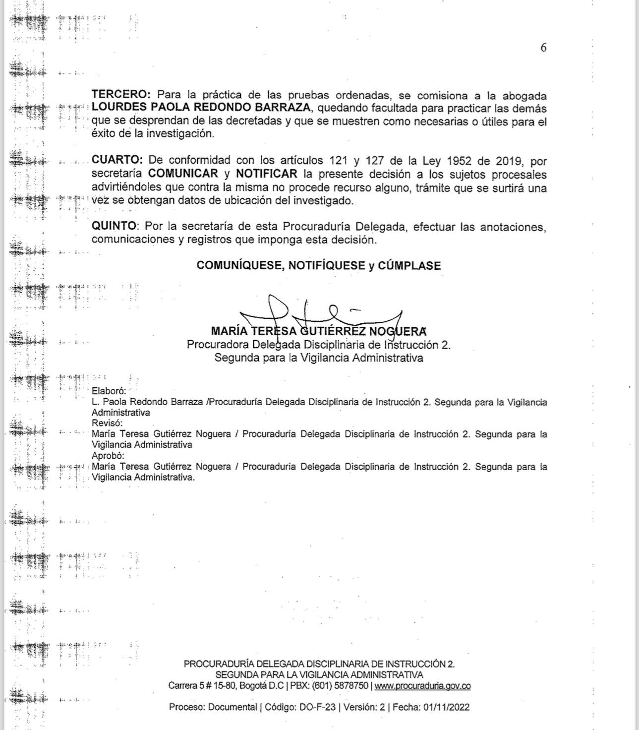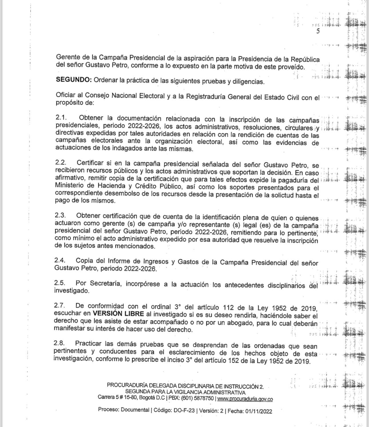 En el Auto expedido, la Procuraduría solicita, entre otros puntos, oficiar al CNE y a la Registraduría General del Estado Civil con el fin de que entreguen documentación relacionada a la inscripción de la campaña, los actos administrativos, resoluciones y cualquier otro documento expedido por las dos instituciones en relación con la rendición de cuentas de las campañas y evidencias de actuaciones de los indagados ante las mismas.