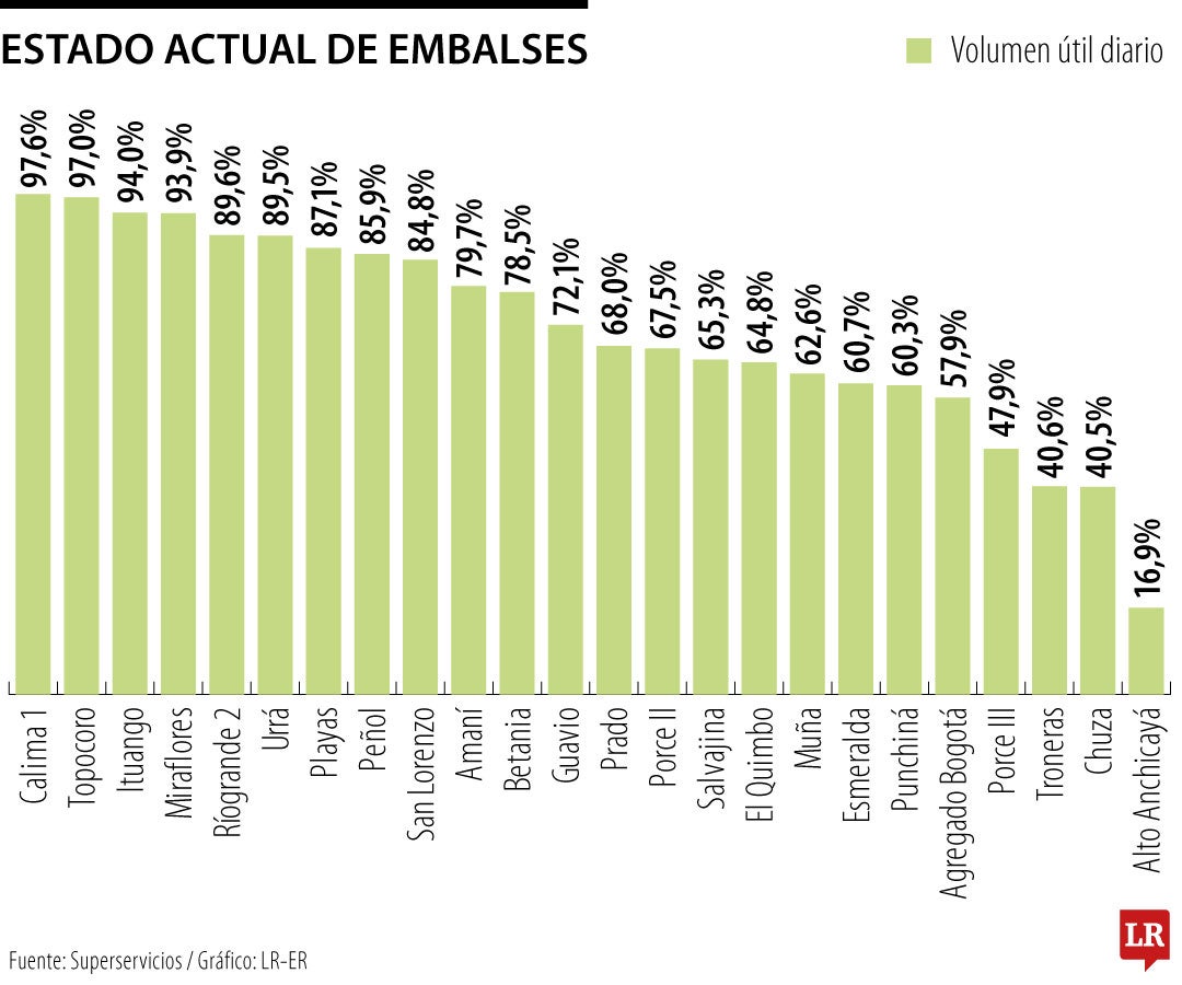 Los tres embalses que registran los volúmenes útiles diarios más altos son Calima 1, con 97,6%; Topocoro, con 97%; e Ituango, con 94%. A estos le siguen con niveles también superiores Miraflores, Ríogrande 2 y Urrá, con 93,6%, 89,6% y 89,5%, respectivamente.