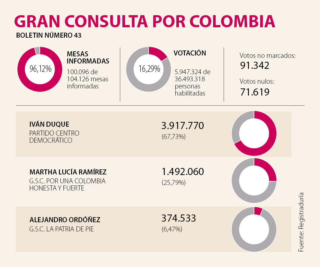 El ahora candidato de la coalición Gran Consulta por Colombia, Iván Duque, prácticamente derrotó a sus contrincantes con 4,016 millones de votos, mientras que Marta Lucía Ramírez registró para el boletín 60, tuvo 1,5 millones de tarjetas electorales marcadas a su favor. El exprocurador destituido, Alejandro Ordóñez, sumó en ese boletín 382.978 votos en la consulta interpartidista de la derecha.