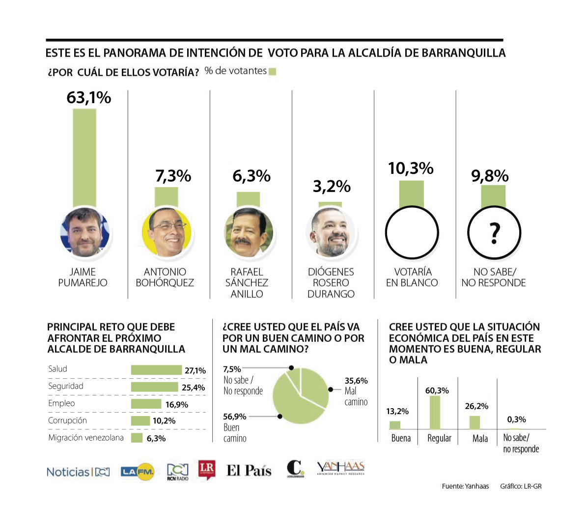 De acuerdo con los resultados de la Gran Encuesta, (Noticias RCN, La F.M., RCN Radio, El País, El Colombiano y el Diario La República) hecha por Yanhaas, la intención de voto para la Alcaldía de Barranquilla tiene un líder absoluto y es Jaime Pumarejo, pues a la pregunta sobre por cuál de los candidatos votaría, el 63,1% de los barranquilleros respondió por el exministro de Vivienda.