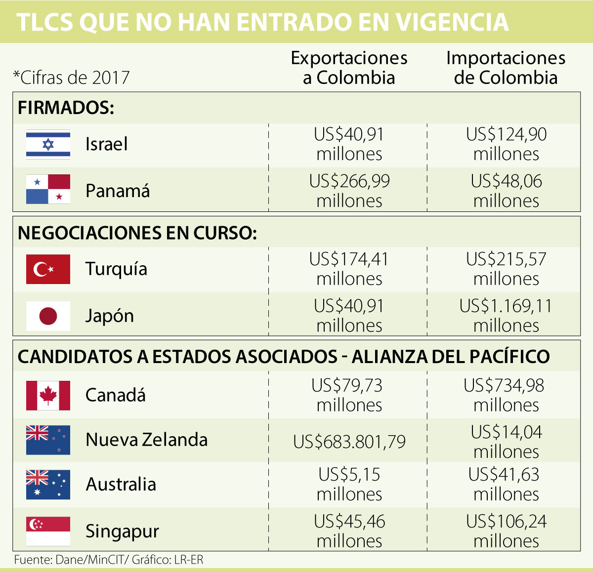 A menos de seis meses de finalizar el gobierno de Juan Manuel Santos, son varias las negociaciones de tratados de libre comercio (TLC) que no han entrado en vigencia o siguen en diálogos. Aunque la ministra de Comercio, Industria y Turismo, María Lorena Gutiérrez, dijo que en lo que queda de este mandato no se firmarán más tratados, pues se cumplió la agenda pactada de 16 convenios, estos acuerdos que aún no están en marcha representan un mercado clave.