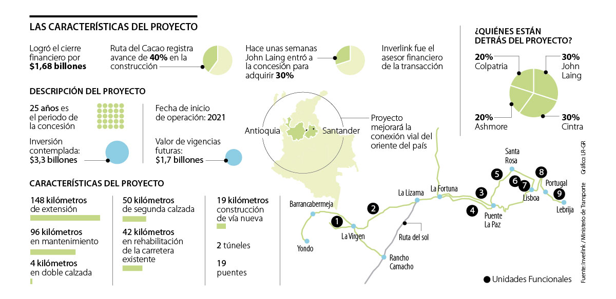 Uno de los negocios de infraestructura que se venía gestando desde hace menos de 12 meses, y del cual ya se había anunciado un acuerdo de adquisición, llegó a feliz término. Este lunes, tras dos meses de anuncio, la multinacional John Laing concretó las exigencias legales de la compra de 30% de la concesión de la Ruta del Cacao, una movida que desde ya no solo le da un nuevo impulso a la vía de 4G entre Bucaramanga, Barrancabermeja y Yondó, sino además es una muestra del retorno de la confianza inversionista al sector.