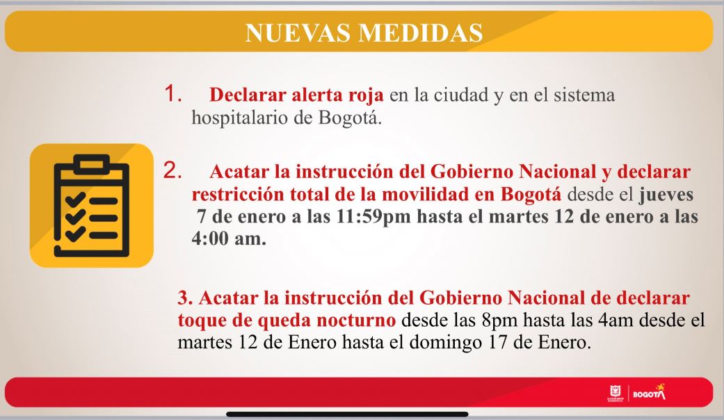 Ante esta nueva evidencia y teniendo en cuenta de que puede haber una nueva cepa circulando, la alcaldesa dio a conocer las medidas concretas para la ciudad. "Declaramos alerta roja en toda la ciudad de Bogotá y declaramos restricción total de la movilidad desde hoy 7 de enero de corrido hasta el martes a las 4:00 a.m., durante estos cuatro días toda la población de Bogotá debe quedarse en casa y no salir".