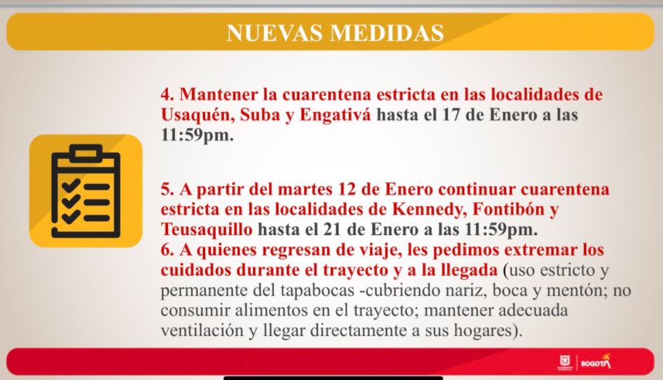Por otro lado, la alcaldesa manifestó que desde este martes 12 de enero a las 00:00 horas hasta el próximo jueves 21 de enero a las 11:59 p.m., entrará en cuarentena estricta Kennedy, Fontibón y Teusaquillo. De igual forma, se mantienen las medidas de cuarentena estricta que venían rigiendo en las localidades de Usaquén, Suba y Engativá hasta el próximo 17 de enero a las 11:59 p.m.
