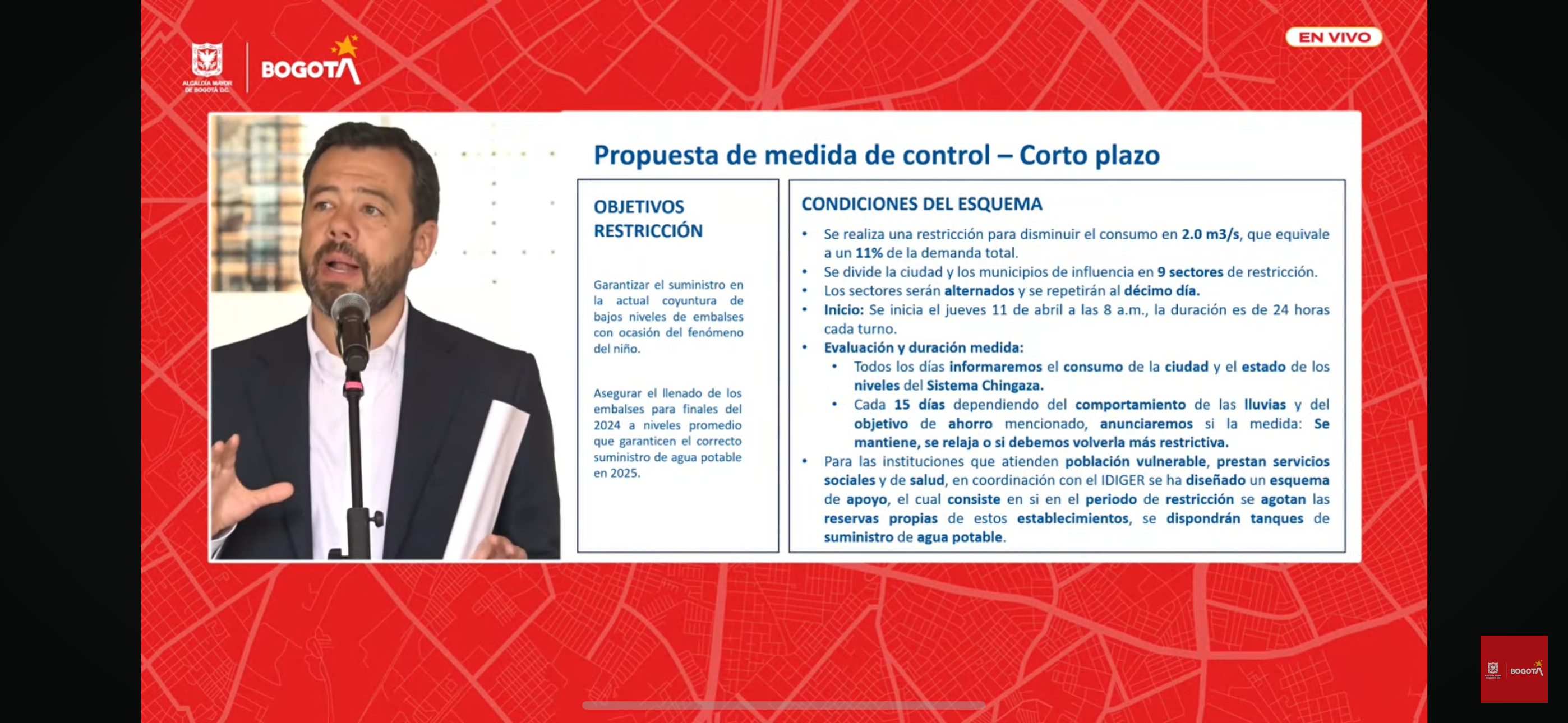 El alcalde mayor de Bogotá, Carlos Fernando Galán, anuncia cuáles será las medidas que tomará la administración distrital ante los bajos niveles de los embalses en el centro del país.