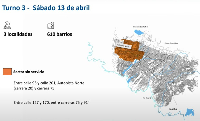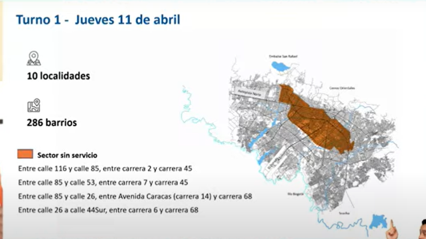 La directora del Acueducto de Bogotá, Natasha Avendaño, señaló que la meta es lograr 11% del ahorro para poder pensar en levantar las restricciones. “Necesitamos duplicar ese ahorro voluntario, pasamos de 18 metros cúbicos por segundo a 17 y necesitamos bajar cerca de 16 metros cúbicos. Las zonas van a definirse teniendo en cuenta la operación del sistema. Este es un ahorro de 11% del consumo de la ciudad. No será toda la ciudad al tiempo. Anunciaremos las zonas para alcanzar ese ahorro”, explicó Avendaño.