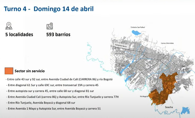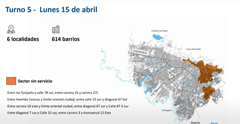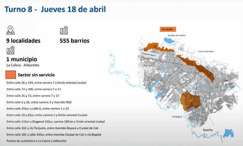 La única localidad que no quedaría afectada por el racionamientos es Usme, debido a que cuenta con el embalse El Dorado que garantizará el suministro del agua para los habitantes de este sector.