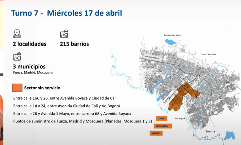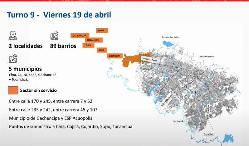 Pero Bogotá no será la única ciudad con racionamiento. Ocho municipios de Cundinamarca también se unirán a esta medida para buscar un mayor ahorro en la región. Entre los municipio que tendrán recortes en el suministro están Funza, Madrid, Mosquera, Tocancipá, Chía, Cajicá, Gachancipá, La Calera, y Soacha.