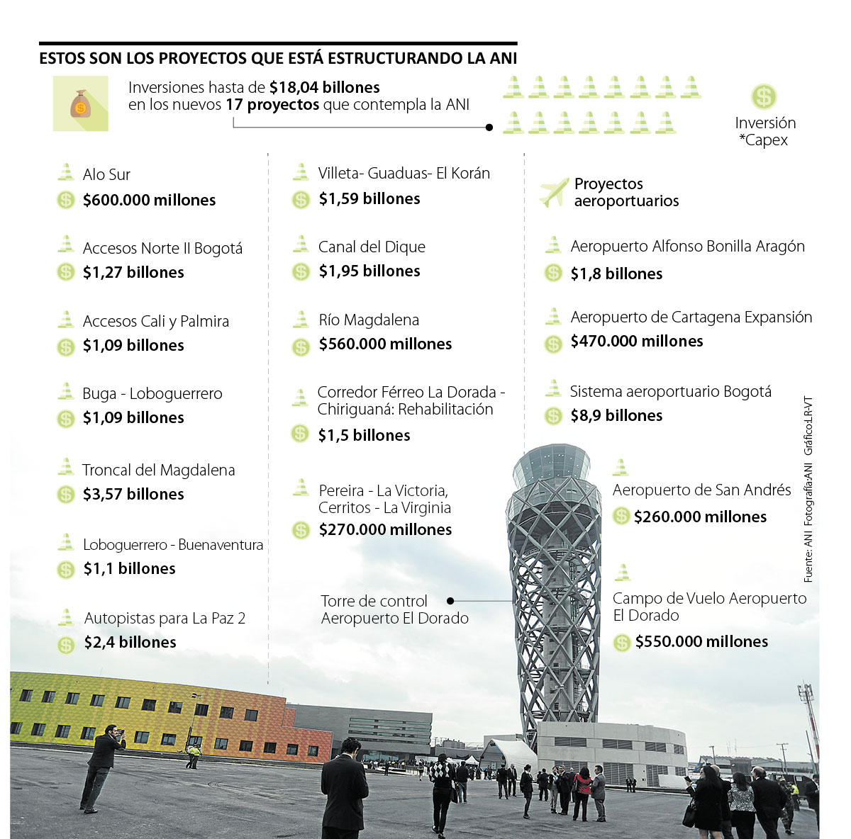 El portafolio de proyectos a los que le apuesta la ANI se divide en varios frentes de obras: 11 viales, cinco en terminales aéreas y uno de corredor férreo. Aunque en algunos casos son ampliaciones o intervenciones, lo cierto es que con estos proyectos el Gobierno prevé no solo aumentar la productividad en las regiones, sino además atraer mayor inversión. Esto debido a que algunas construcciones se harán mediante Asociaciones Público Privadas (APP) e Iniciativas Privadas (IP).