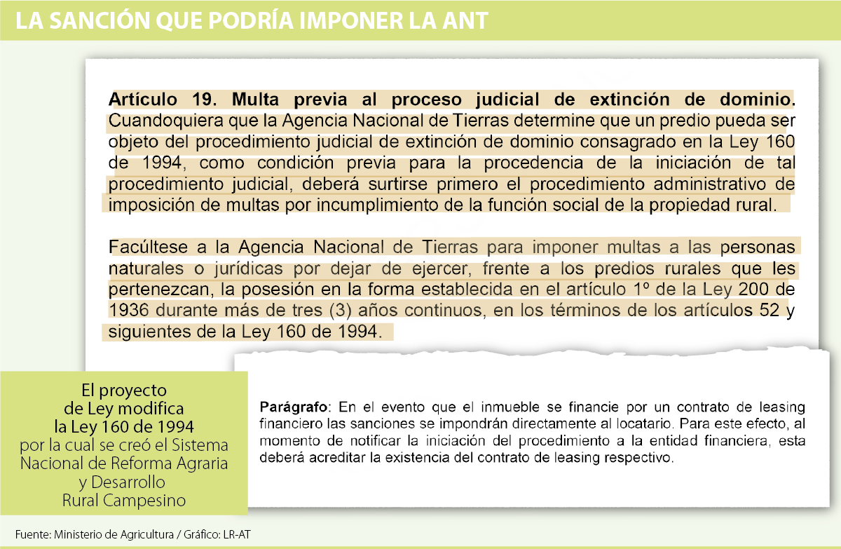Aunque según Miguel Samper, director de la ANT, en la última versión del proyecto que se radicó el martes para consulta previa se hacen varias claridades sobre la extinción del derecho de dominio, como definir qué se entiende por no explotación económica de la tierra o las disposiciones acerca de las fincas de recreo, lo cierto es que artículos como el 19 facultan a la entidad para imponer multas.