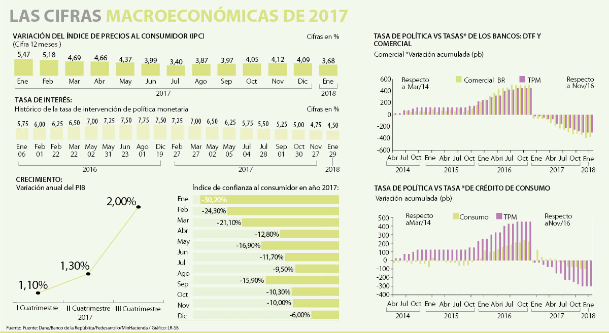 Y es que según el último reporte del Departamento Administrativo Nacional de Estadística (Dane), en los últimos doce meses (entre febrero de 2017 y enero de 2018) la variación del IPC fue 3,68%, menor en 1,79 puntos porcentuales a la registrada en el mismo periodo del año anterior, cuando fue 5,47%.