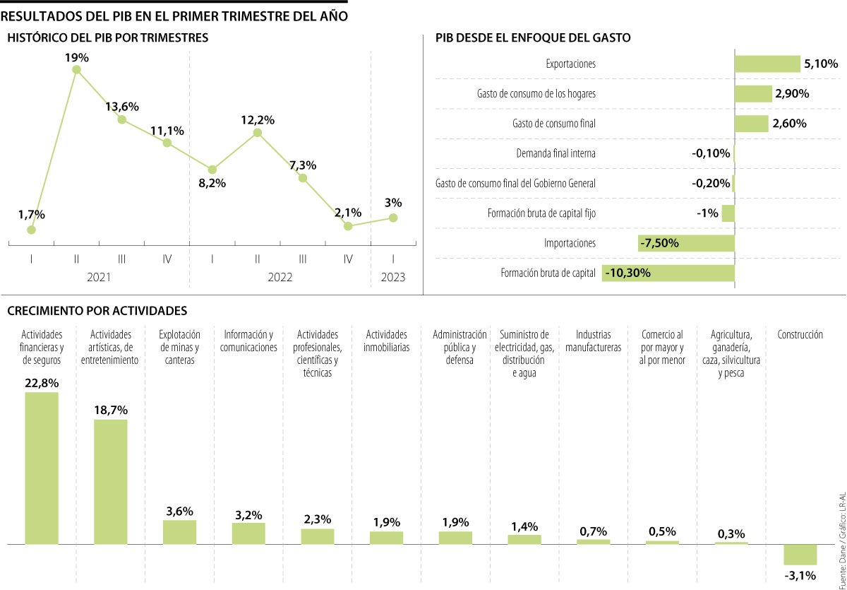 Ese PIB de 3% se registró luego de que el Indicador de Seguimiento a la Economía llegó a 1,6% en marzo. Entonces, según el Dane, las actividades financieras y de seguros fueron las de mayor aporte en el primer cuarto de este año, con un punto porcentual del total y una variación anual de 22,8%. “Las actividades de aseguramiento y las indemnizaciones son las que han estado más dinámicas”, dijo Piedad Urdinola, la directora del Dane.