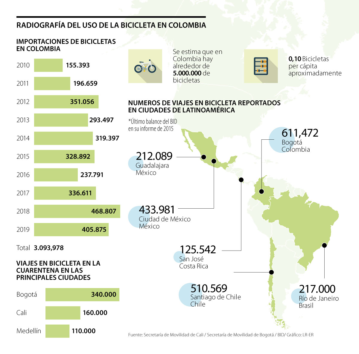 Las características naturales de este vehículo de dos ruedas han permitido, por ejemplo, que en Bogotá ya se registren 340.000 viajes diarios. De acuerdo con las cifras de la Secretaría de Movilidad, en este periodo de cuarentena los bogotanos han optado por este medio para desplazarse a su trabajo o para hacer las compras. En ese total, según el Distrito, el corredor de la Avenida Américas desde la NQS hasta la carrera 50 ha registrado 18.585 ciclistas al día, muy por encima del corredor Autosur desde la Avenida Cali hasta Av. Villavicencio, con 17.781 biciusuarios al día, por ejemplo.