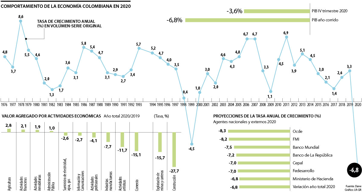 Como ya lo pronosticaban diferentes actores económicos, el Departamento Administrativo Nacional de Estadística (Dane) informó que el PIB de Colombia cayó 6,8% en 2020, una cifra que refleja las afectaciones de la pandemia, de los confinamientos y de las restricciones a la actividad económica del país.