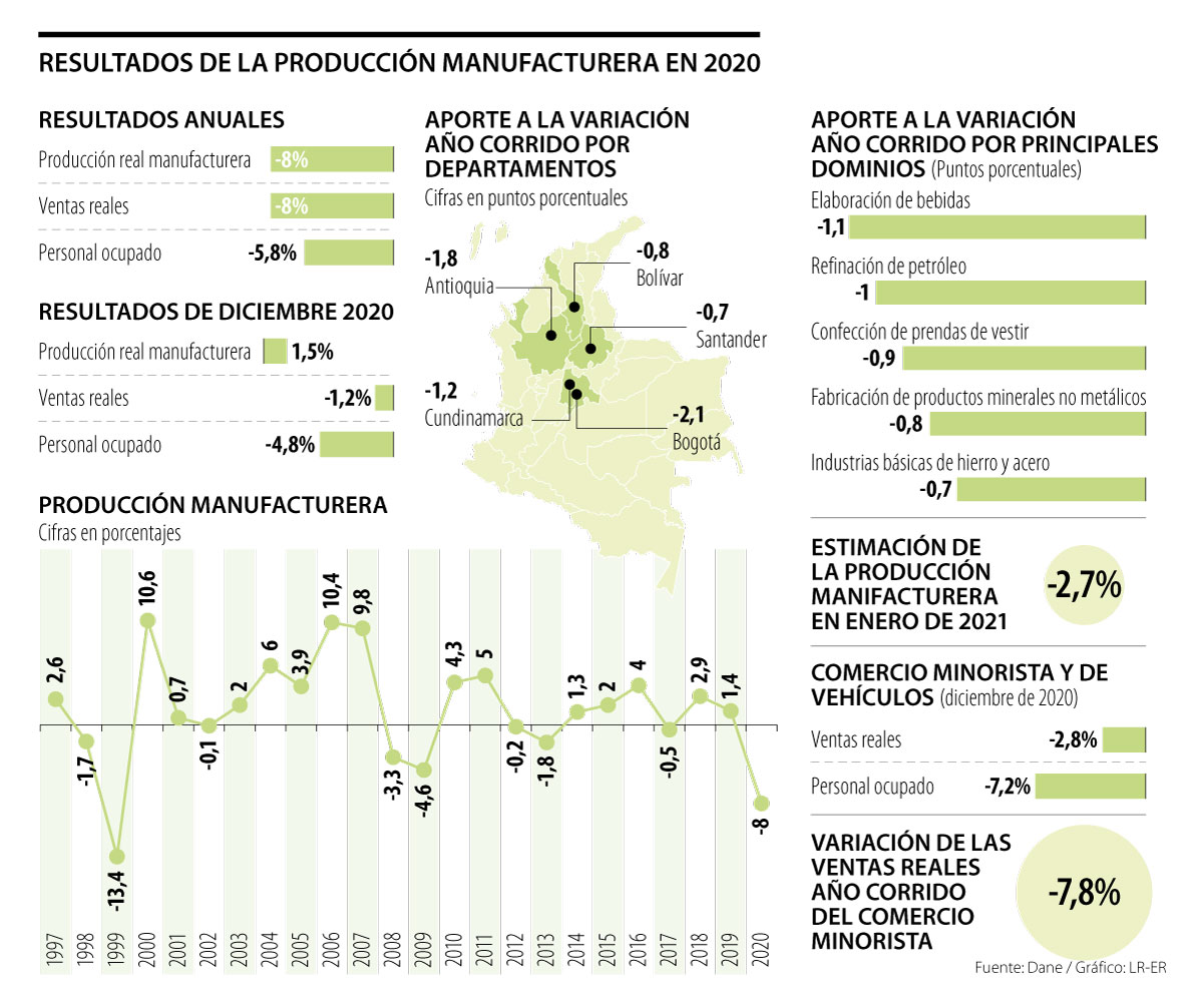 El Departamento Administrativo Nacional de Estadística (Dane) informó que la producción real de la industria manufacturera se contrajo 8% en 2020 con respecto a los resultados de 2019. Esta es la mayor contracción desde 1999, cuando la producción disminuyó 13,4%. Desde esa fecha se habían presentado contracciones en 2002 (-0,1%), 2008 (-3,3%), 2009 (-4,6%), 2012 (-0,2), 2013 (-1,8) y 2017 (-0,5%).