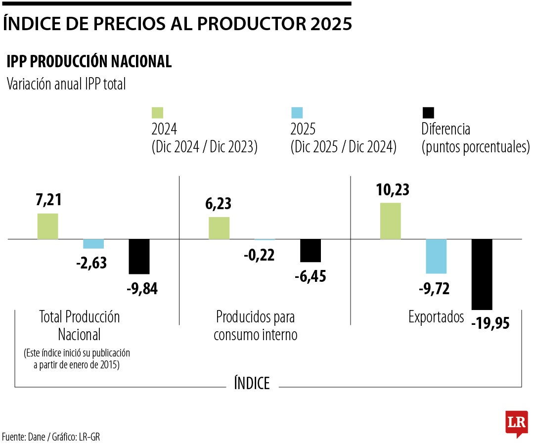 El comportamiento mensual también fue negativo. En diciembre, frente a noviembre de 2025, el IPP cayó 0,39%. En este periodo, agricultura y pesca (-1,77%) y minería (-1,63%) volvieron a registrar caídas superiores al promedio, mientras que la industria manufacturera fue el único sector con una variación positiva (0,30%).