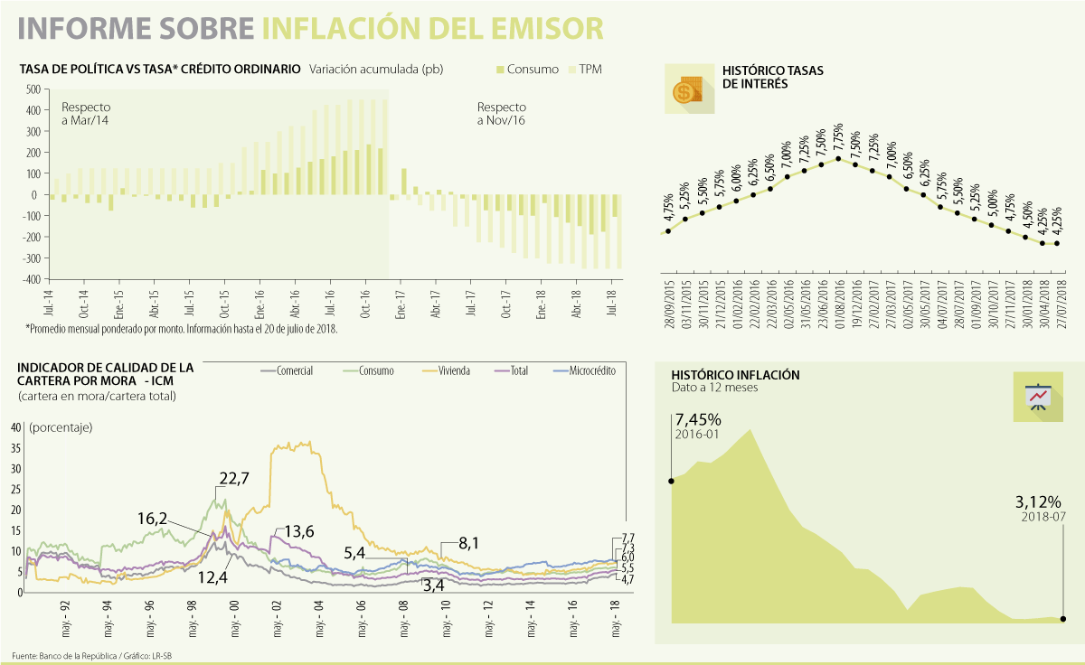 En materia de inflación, el informe destacó que las noticias han sido “excelentes”, al pasar de un Índice de Precios al Consumidor (IPC) creciendo hace año y medio a 9%, a estar cerca a 4% a finales de 2017 y llegar a junio de 2018 a 3,12%, lo que se ubica dentro del rango de entre 2% y 4%. “Llegaremos a nuestra meta de largo plazo de 3% en el segundo trimestre de 2019. En los últimos meses, hemos tenido muy buenas noticias. No obstante, no todos los rubros están presentando el mismo comportamiento como es el caso de los no transables o los regulados. También esperamos que la inflación de alimentos sea estable (entre 2% y 2,5% este año) a no ser de que se presenten choques externos como un fenómeno de El Niño”, aseguró Echavarría.