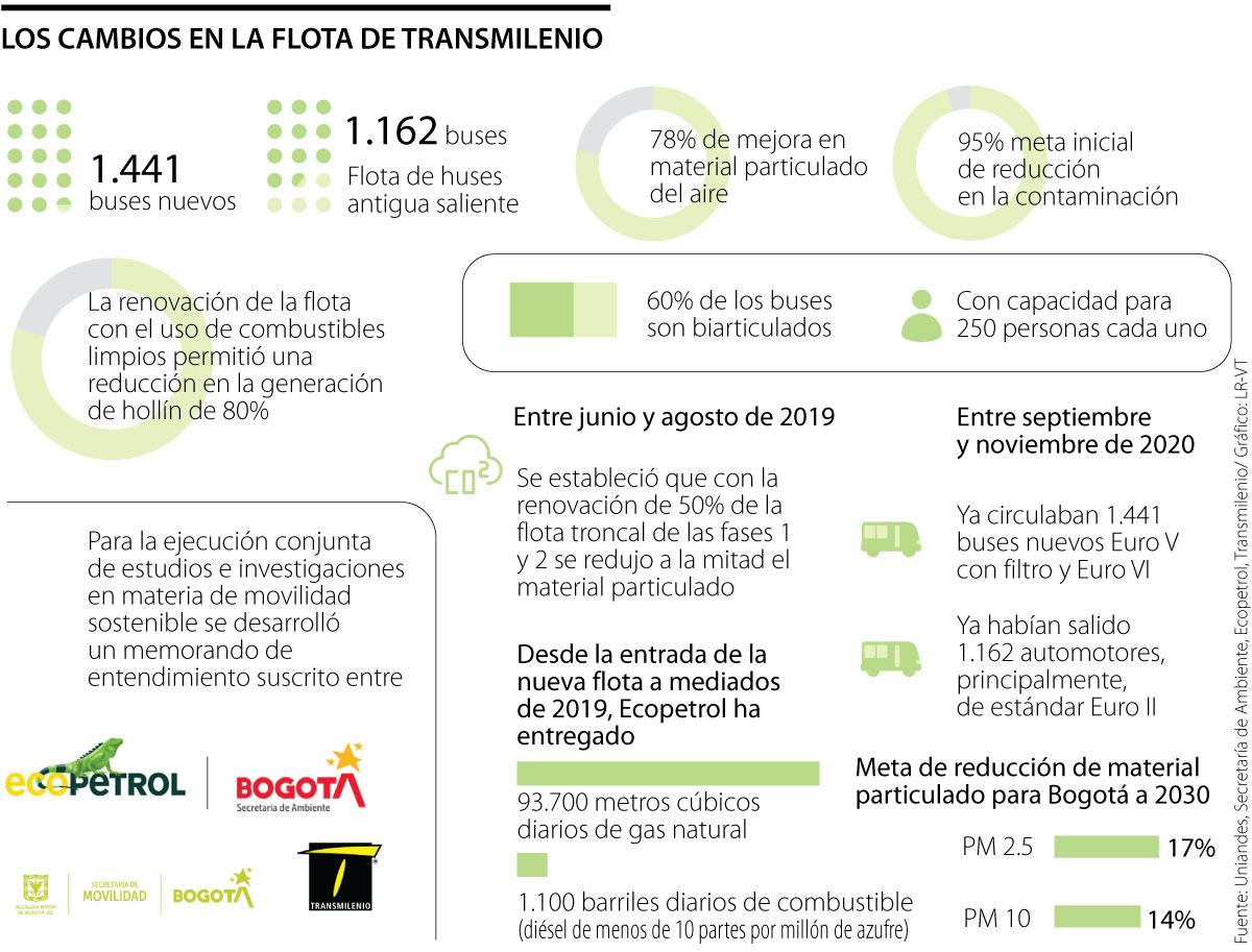 Casi dos años después, la Universidad de Los Andes realizó un estudio ambiental que tuvo como fin determinar el impacto del nuevo parque automotor sobre la calidad del aire de la capital. El resultado de dicho análisis fue que, gracias a los mejores estándares de emisión y al uso de combustibles más limpios, se evidenció una mejora de 78% en la calidad del aire que respiran los usuarios de este sistema de transporte.