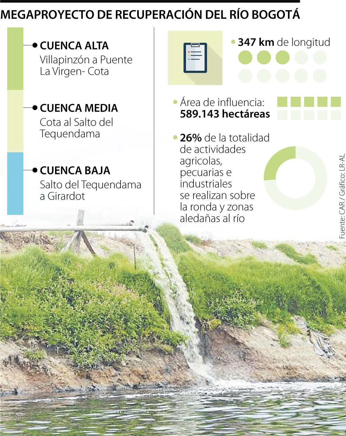 El megaproyecto de la recuperación del río se divide en tres obras: la Planta de Tratamiento de Aguas Residuales, Ptar, Canoas, a cargo de la Empresa de Acueducto y Alcantarillado; y Ptar Salitre y la Adecuación Hidráulica y Recuperación Ambiental, a cargo de la CAR. Se establecieron dos ejes fundamentales para iniciar con la recuperación del río: el saneamiento y recuperación del río Bogotá y, por otro lado, la adecuación hidráulica del río Bogotá.