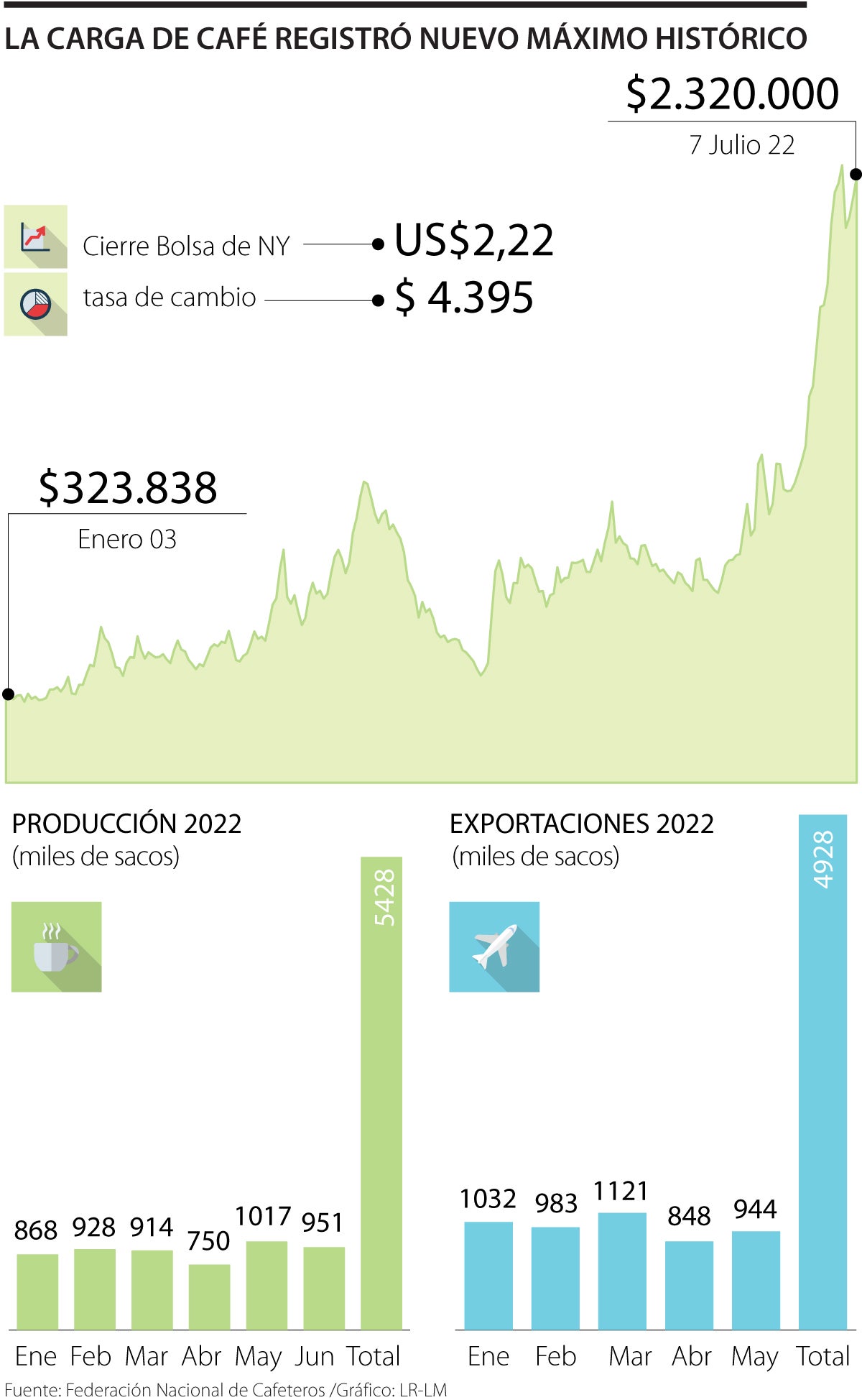 Sin embargo, y aunque parezca contradictorio, las exportaciones van por buen camino, pues el cierre de la Bolsa de Nueva York quedó en US2,22 millones. Vélez explica que “se ha visto un crecimiento es la exportación. En junio el alza fue de 6% y en lo corrido del año es de 2%. Entre enero y junio, las ventas al exterior han totalizado 5,87 millones de sacos de café, mientras que en el mismo lapso de 2021 fue de 5,74 millones”