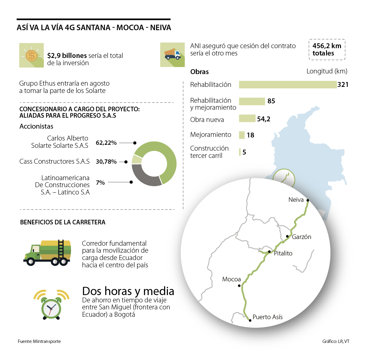 Todo estaría listo para que a más tardar el otro mes se realice la cesión del contrato de la vía Santana - Mocoa - Neiva al Grupo Empresarial Ethus. Se trata de un negocio que se ha venido gestando desde inicios de este año y el cual se definiría ahora que los Solarte, accionistas mayoritarios de ese proyecto, le entreguen su participación a este nuevo inversionista, que tiene una larga trayectoria en el sector de infraestructura y el cual se encargaría del desarrollo de más de 450 kilómetros de esta carretera 4G.