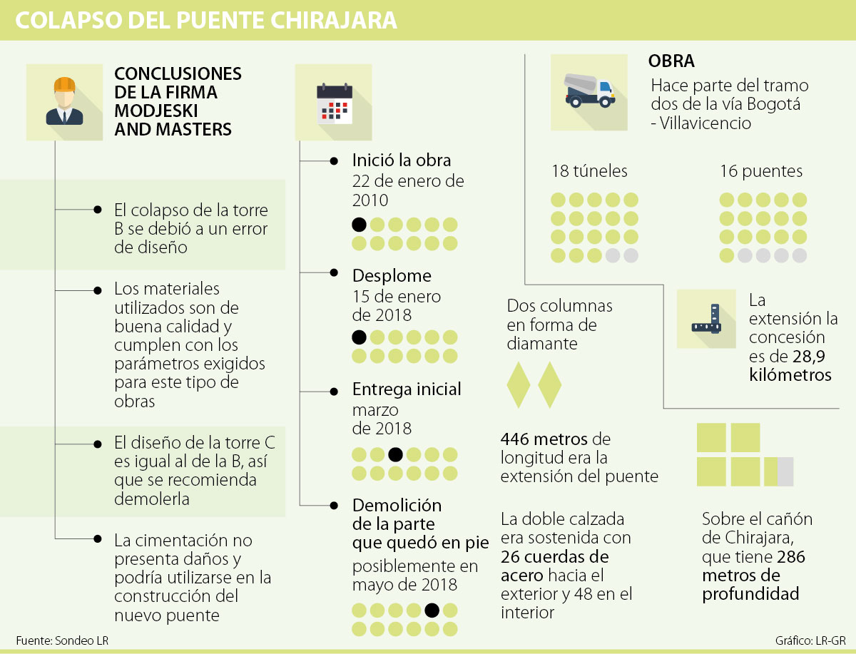 Aunque aún no se tiene claridad sobre el monto de las sanciones, al menos ya se saben las causas, ya que los expertos concluyeron que la pila B del Puente Chirajara colapsó debido a un error en el diseño, a una deficiencia en la capacidad del tabique y de la losa cabezal; ya que el ingeniero encargado del diseño, Héctor Urrego, supuso erróneamente la resistencia proporcionada por el tabique.