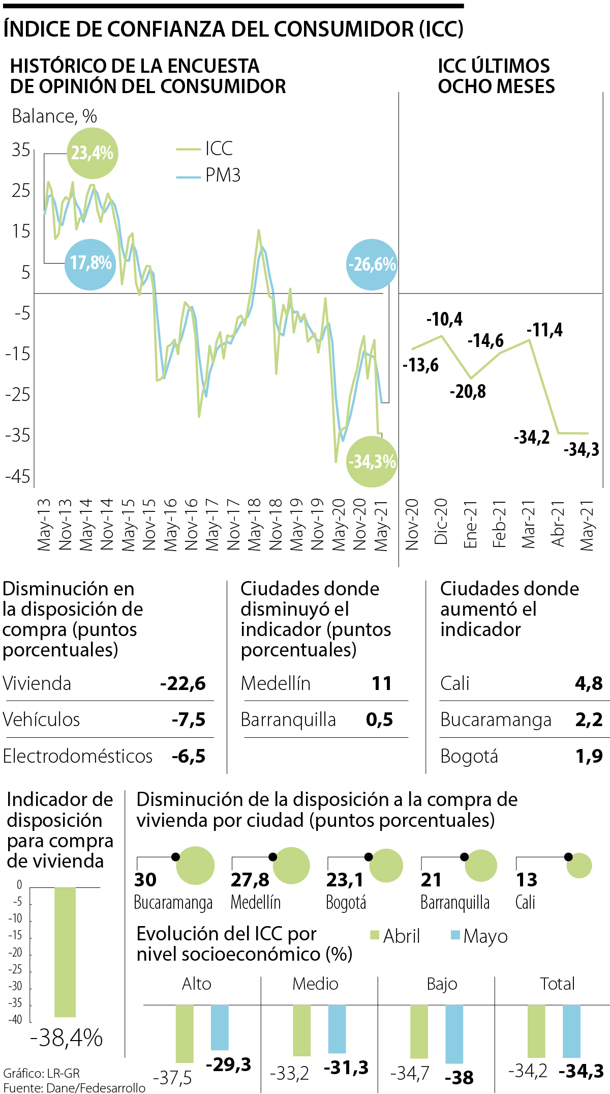 Durante mayo, el indicador de disposición a comprar vivienda se ubicó en -38,4%, lo que significó una caída de 22,6 puntos porcentuales frente al mes anterior. Las ciudades donde se registró una menor intención de compra para los inmuebles fueron Bucaramanga (30 puntos), Medellín (27,8 puntos), Bogotá (23,1 puntos), Barranquilla (21,0 puntos) y Cali (13,0 puntos).