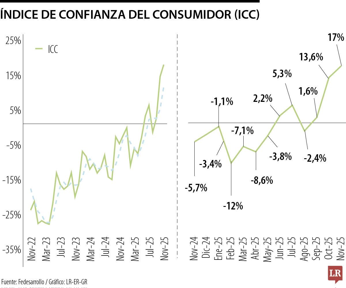 El Índice de Confianza del Consumidor alcanzó un balance de 17,0%, un avance de 3,4 puntos porcentuales frente a octubre (13,6%) y una mejora de 22,7 puntos frente a noviembre de 2024, según la Encuesta de Opinión del Consumidor (EOC) de Fedesarrollo.