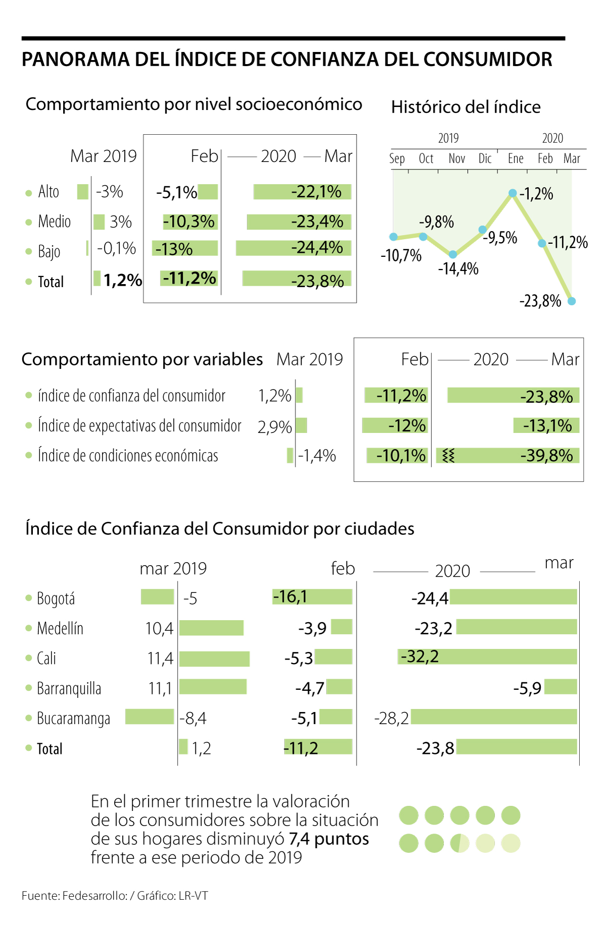 De acuerdo con el documento, los resultados del tercer mes del año se explican por una disminución de 29,7 puntos porcentuales en el Índice de Condiciones Económicas, que llegó a -39,8%; y por una reducción de 1,1 puntos porcentuales en el Índice de Expectativas del Consumidor, que cerró en -13,1%.