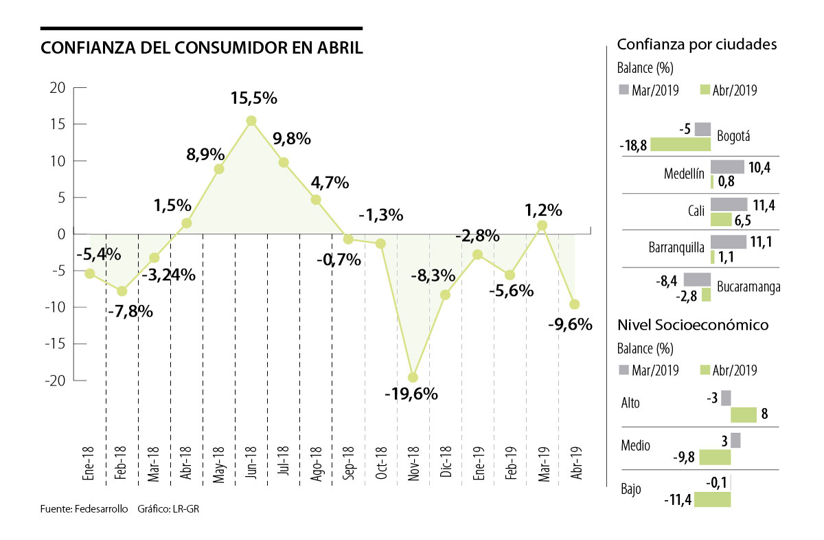 Fedesarrollo destacó que el deterioro en la confianza se generó tanto por una caída en el índice de condiciones económicas, que se refiere a la percepción actual que tienen los consumidores, y que cayó de un nivel de -1,4% en marzo a -14,9% en abril; como el descenso en el índice de expectativas, en el que se pregunta a los consumidores cómo estará la economía en un año, que pasó de 2,9% en marzo a -6% en abril.